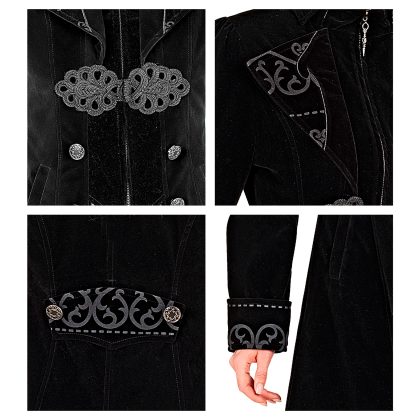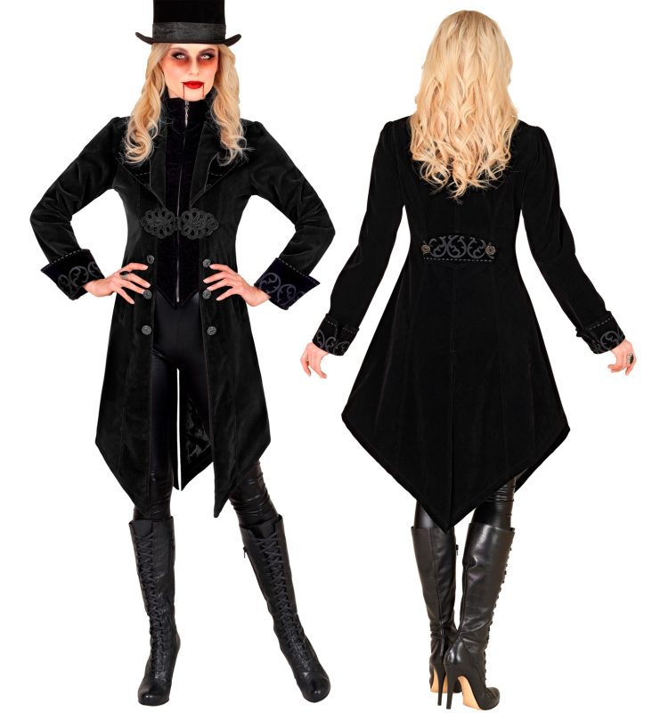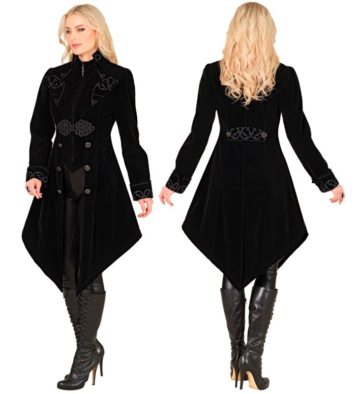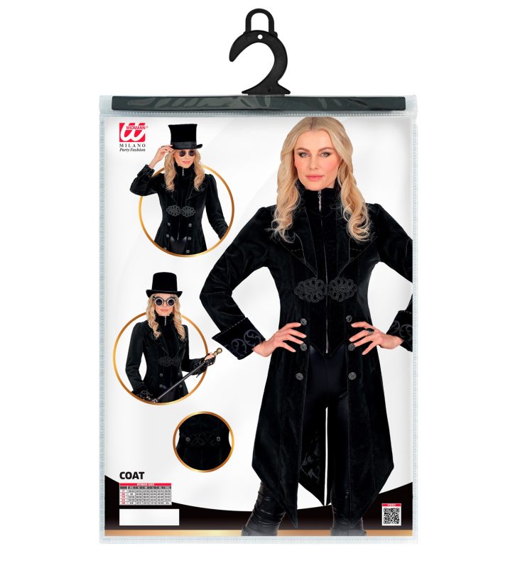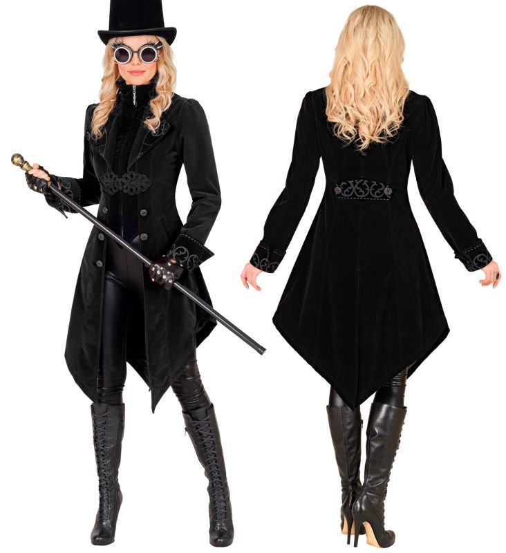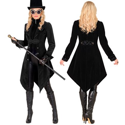 Dámský černý sametový kabát ve steampunk stylu dodá vašemu outfitu nádech elegance a retro tajemna. Perfektní volba pro karneval, cosplay, historické slavnosti i tematické večírky. Hebký samet působí luxusně, zatímco stylové knoflíky a střih podtrhnou jedinečný vzhled. Skvěle ladí s klobouky, brýlemi a doplňky ve steampunk stylu.