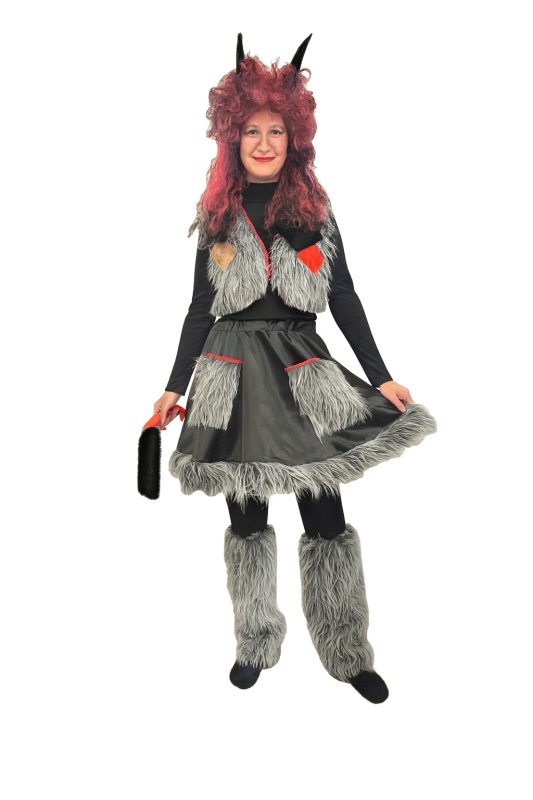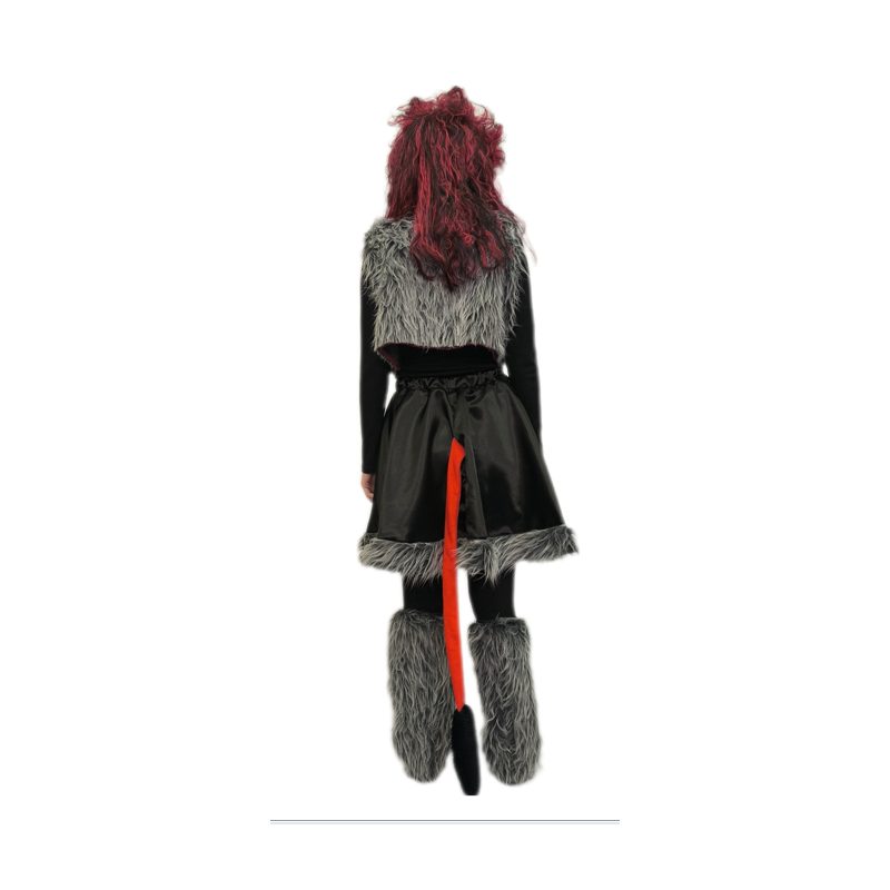 Kostým se skládá z kolové sukně s kapsami na zadním díle nechybí ocas, dolní kraj sukně je ozdobený lemem z plyše, sukně je v pase do gumy pro větší pohodlí. vestička s ozdobnými záplatami, vše doplňují návleky, které jsou opatřeny lemovací gumičkou. Použitý plyš je české výroby.