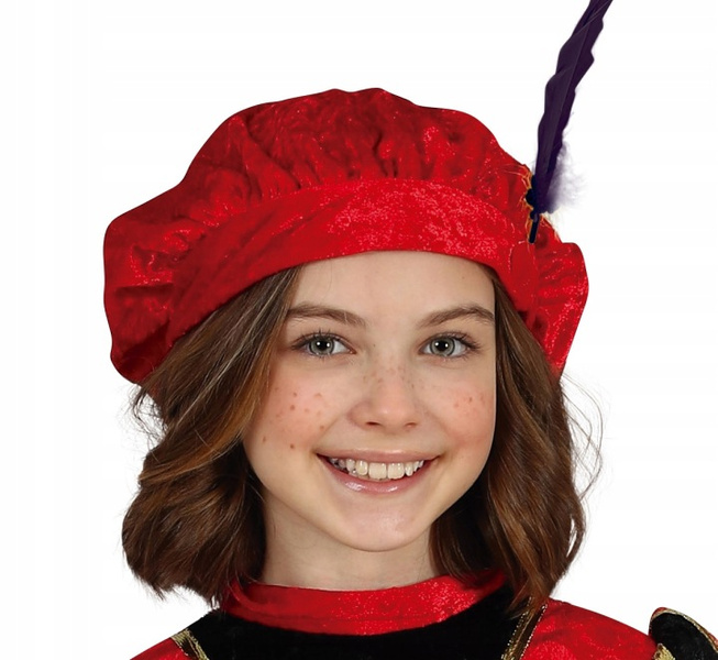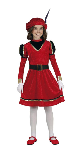 Popis produktu kostým červený páže Sada obsahuje: šaty, klobouk. Červené šaty s dlouhým rukávem. Červený klobouk s ozdobným černým peřím.Velikost 128 Materiál: 100% polyester.