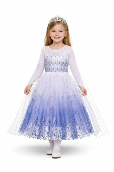 Popis produktu dívčí kostým princezna Bílé šaty s modrým ombré efektem. Zdobené stříbrným potiskem připomínajícím zimu. Rukávy z jemného tylu. Materiál: 100% polyester.