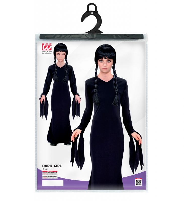 Dívčí kostým Temná dívka inspirovaný postavou Wednesday Addams je ideální pro malé milovnice tajemna. Stylové černé šaty působí elegantně a zároveň strašidelně. Kostým je vhodný pro výšku postavy cca 158 cm. Skvělá volba na Halloween, karneval nebo tematickou párty.