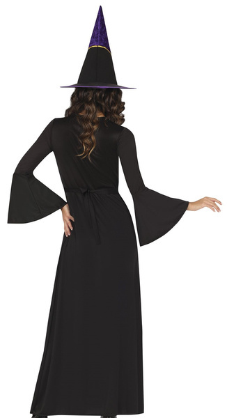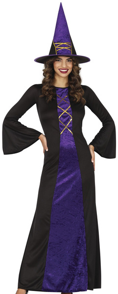 Popis produktu kostým čarodějnice economy Sada obsahuje: šaty, klobouk. Dlouhé šaty v černo-fialové barvě. Oblékají se přes hlavu. Klobouk se zpevněnou krempou (na drátku). Složení: 100 % polyester.