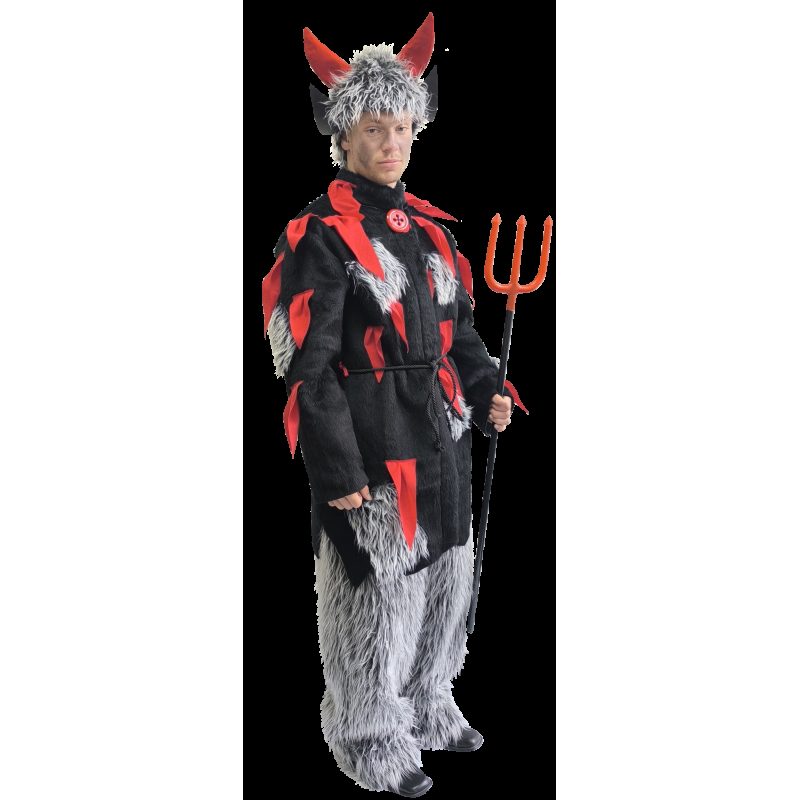 Kostým obsahuje kožich s plamenným vzorem, kalhoty a pásek nebo provaz na převázání, čímž tvoří kompletní a působivý čertovský převlek.