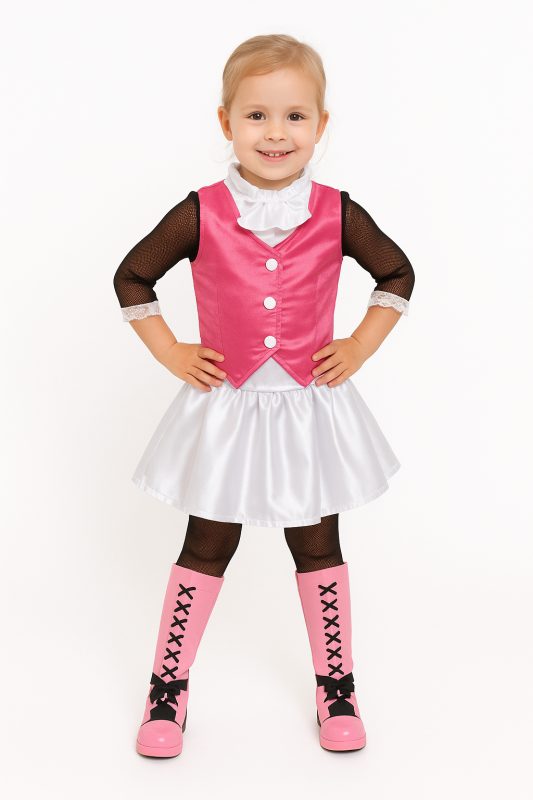 Licenční kostým Draculaura. Obsahuje horní díl s připevněnou vestou, sukni a legíny. Paruka a boty nejsou součástí kostýmu.