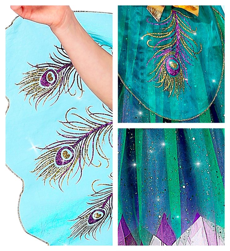 OBSAHUJE: šaty s pavími ocasními závoji, pokrývka hlavy.