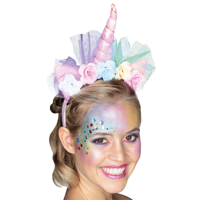 Popis produktu LED čelenka jednorožec včetně baterií Růžová čelenka s ušima a duhovým rohem zdobeným zlatou šňůrkou.Čelenku zdobí pastelové květy a tyl.