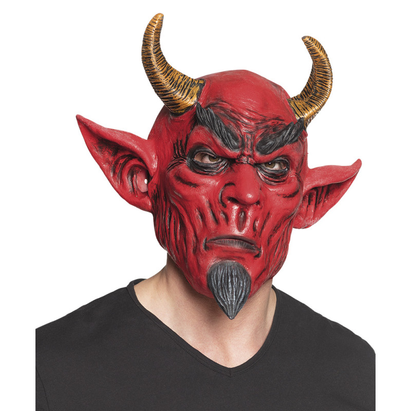 Latexová maska čerta s hnědými rohy, celohlavová. Dospělá velikost. Velice zajímavá maska čerta, kterou využijete nejen na mikulášskou akci. Materiál: 100% latex