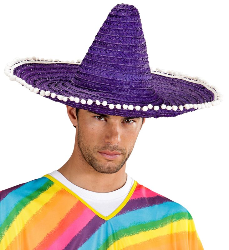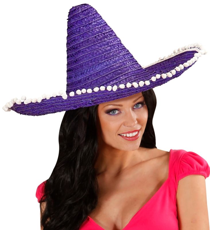 Oživte svůj kostým tímto nepřehlédnutelným mexickým sombrerem ve výrazné fialové barvě. Klobouk zaujme nejen svou sytou barvou, ale také dekorativním bílým lemem po obvodu, který mu dodává stylový a hravý vzhled.