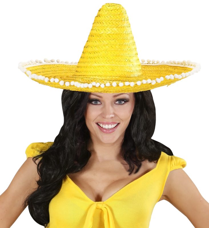 Zářivě žluté mexické sombrero s ozdobným bílým lemem je ideální doplněk na párty, karneval i tematické oslavy.
