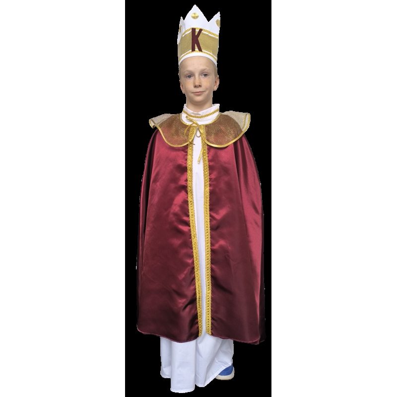 Plášť z kvalitního pevného saténu, doplněný o zlatý prýmek v přední části a zlatým síťovaným límcem olemovaným zlatou lemovkou dodá opravdový sváteční dojem Třech Králů.